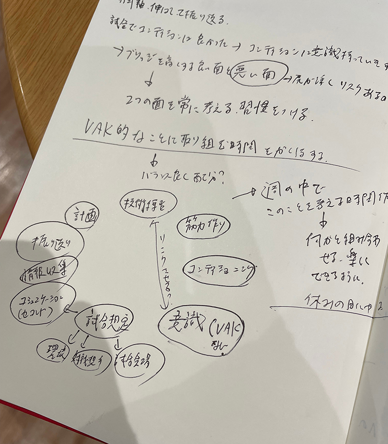 阿久津選手:コンディションの調整に意識が行きすぎ、振り返れば本番を想定する時間を取る計画が薄くなっていました。4月の全日本は逆にコンディションが良くなることは一切期待できなかったので、とにかく練習できない分、試合想定をする時間に集中していました。試合までベンチプレスはほとんど練習できなかったのですが、その年に初めて持つ重さ(217.5kgと225kg)をしっかり2本成功しました。とてもシンプルなことなのですが、どこかだけに意識を取られると、どうしても他への意識が薄くなってくる。そこで、意識を向けておく必要がある全ての要素を洗い出しました。そうして出てきた「練習、身体、生活、情報収集、本番への準備、コミュニケーション、計画、仕事、振り返り」の9項目は、今の自分の振り返りにも必要と考えています。また、それぞれの項目に、中・小項目も設けています。