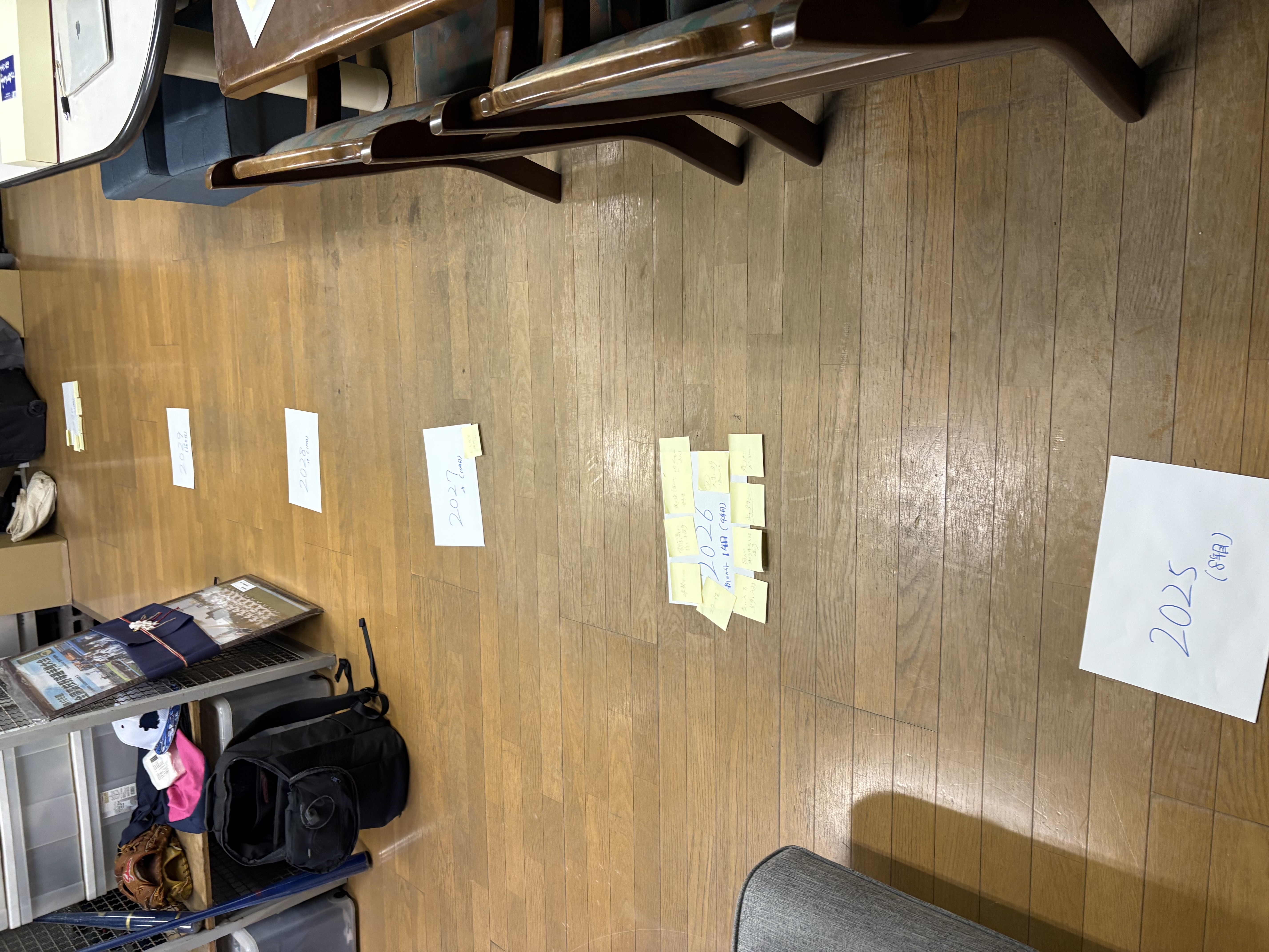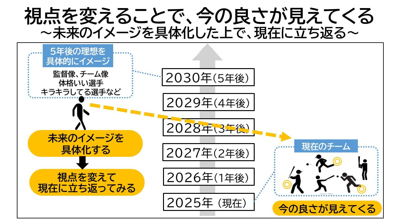 辻岡コーチ:2025年~30年の時間軸を床に見える化し、5年後の理想のチームや監督の姿を描いて、そこに必要なのはどんな選手か、体形や顔つき、姿勢など具体的に思い浮かべてもらいました。「その為に〇年にはスカウトしたいから、あの指導者に連絡をして、練習を見せてもらって、、」と検討される中、一旦現在に目を向けていただくと、ふと「背が高いって言ったら、あいつも背が高いな」とか、「あいつキラキラしてるじゃん」と今のメンバーを思い出されました。 スカウト活動は今後も必要あるかと思いますが、今のメンバーに居ないからするのではなく、視点を変えることで今のメンバーの良さに気づくことが出来たのかと思います。