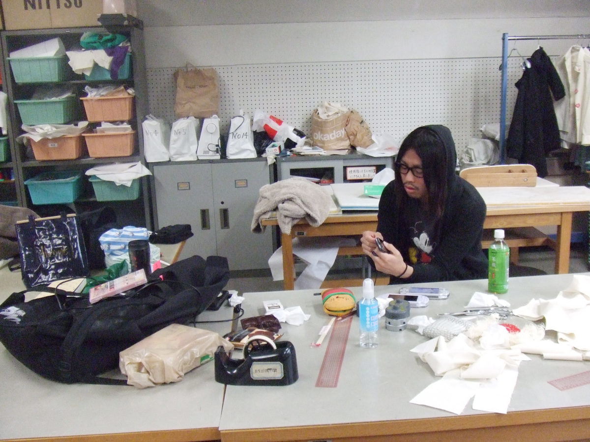 桜美林大学です。本当は専門に行きたかったんですけど、親に四大に行けと言われて。デザインとかまったく勉強してこなかった自分が、専門に行ってる人たちに勝つには何か武器が必要だと、それには1から作り方を学ぶより、先生と仲良くなって現場のことを教えてもらおうと考えました。当時はコム デ ギャルソンが好きで、メンズのデザイナーだった田中さんという方が桜美林大学で講師をしていると知って、その人に教わりたいと思い、進学を決めたんです。洋服専門の学部はなかったんですけど、テキスタイルの勉強をして、布から洋服をつくるようなことをやってました。勉強も、人づきあいもすごく楽しくて、本当に大事な時間でしたね。