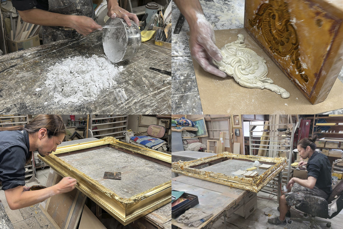 まず、お客さんからいただいた注文をもとに、木工職人が木を削って木枠を作り、組み上げます。これを「木工」と呼びます。その次に「仕上げ」という工程があって、木枠に下地を塗ったり、木型を使って装飾をつくり、それを木枠に乗せて色をつけたり、箔押しをしたり、さらに新しいものを古く見せる「古美(ふるび)」と呼ばれる加工を施したりします。その「仕上げ」が僕、額縁職人としての担当です。その後、額装担当が「まとめ」と呼ばれる工程を経て、額縁が完成します。